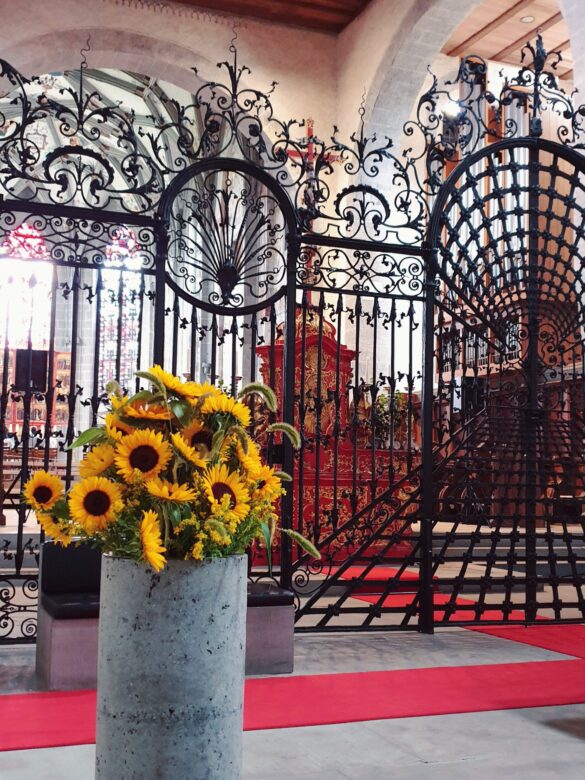 Pioggerellina discreta e fastidiosa: tutti al riparo della terza chiesa… un campo di girasoli la circonda.